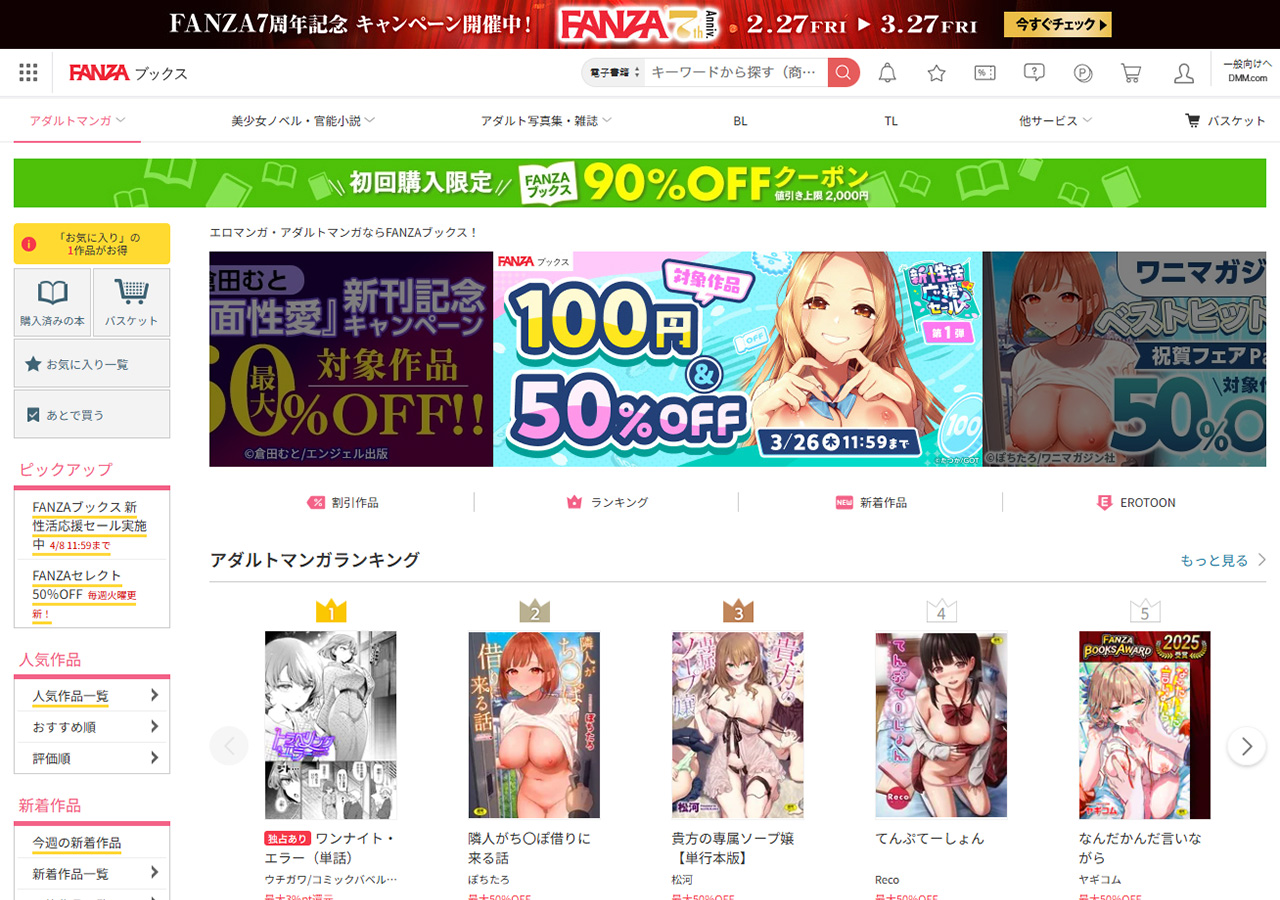まずFANZAでは、「新性活応援セール」を4月8日(水)11:59まで開催。内容は「限定クーポン」の配布、単話を対象とした「100円キャンペーン」、単行本を対象とした「50%OFFキャンペーン」の3本柱で、第1弾~第3弾まで実施。現在は、第1弾を3月26日(木)11:59まで開催中で、毎週木曜日12:00にクーポンやキャンペーン対象作品が更新される。