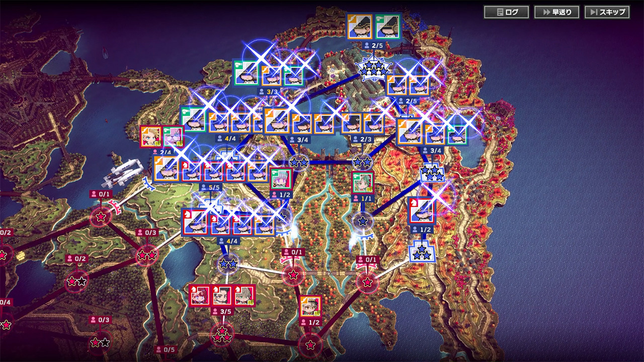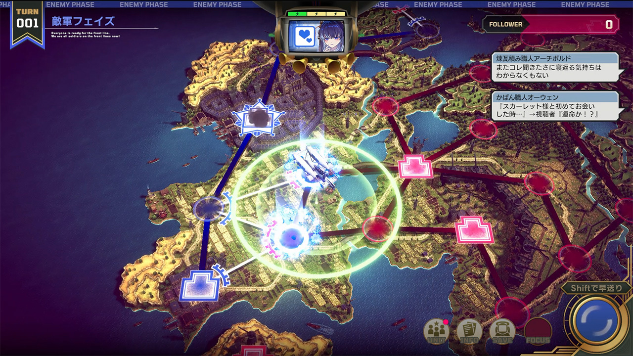 ▲帝國は物量で押し寄せ、対するスカーレット軍はあまりにも少ない。自軍だけが操れる「配信艦」の能力を最大限に活かし、戦場をコントロールしていこう