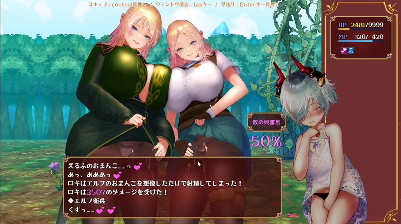 ゲーム部分は、本格的な3DダンジョンRPGとなっている本作。迷宮内を隈なく探索して、魔界の復興に必要な精液やスキル習得に使う素材を集めつつ、クリア条件の達成を目指そう。ただし、迷宮には彼の股間を狙うお姉さんたちが徘徊しており、捕まるとその場でバトルファックに突入。戦闘中は「誘惑攻撃」「前戯攻撃」「フィニッシュ攻撃」「精液強奪」など、多彩なH攻撃でロキを責め立ててくるぞ。また戦闘に敗北してしまった場合、敵のお姉さんに魔界復興のために溜めた精液を奪われることに。その上さらに何度も敗北を重ねると、彼女たちから奴隷契約の誘いが来ることも…!?