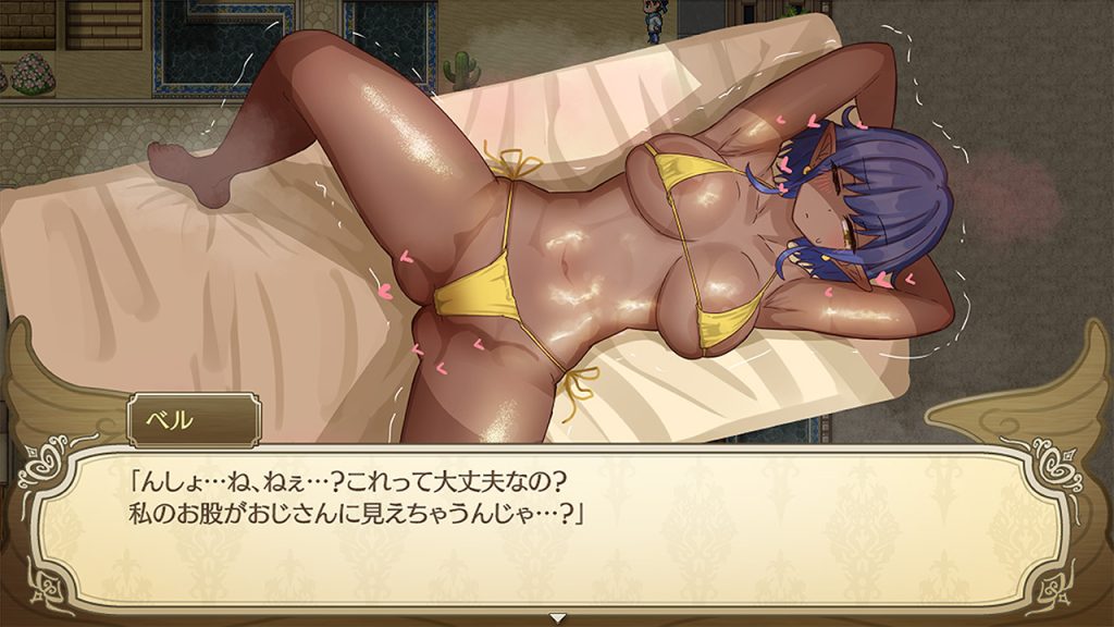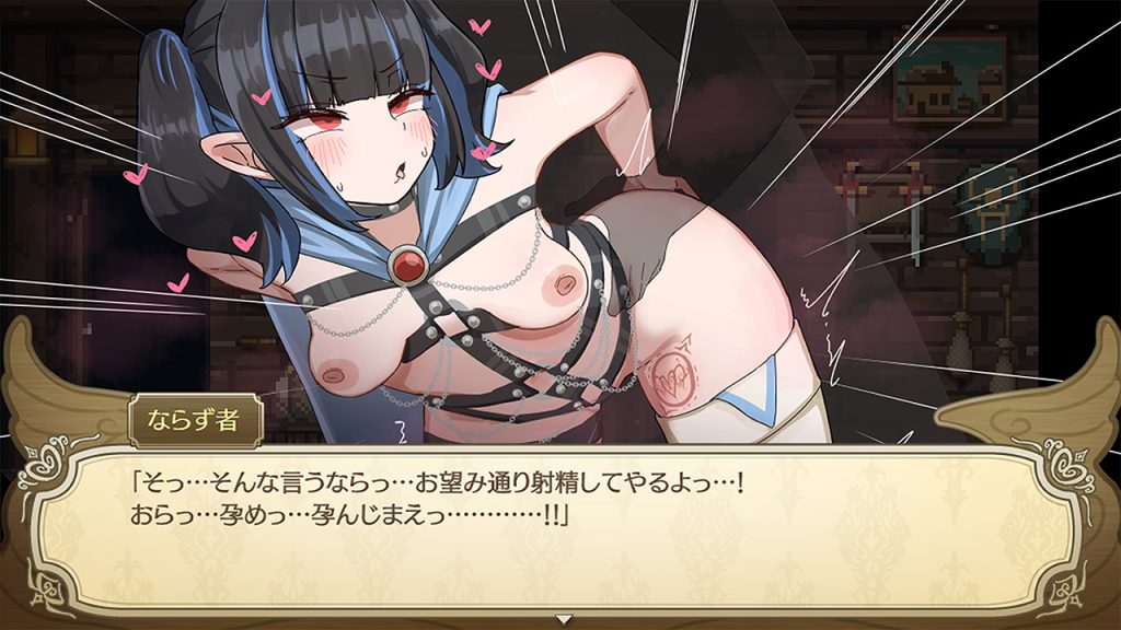 サークルが厳選に厳選を重ねたという激シコシチュに、段階エロシステムを組み合わせたHイベントの数々が一番の見どころだが、それ以外の部分も非常によく作り込まれている本作。例えば、キャラを操作して室内に入ると画面が横スクロールに切り替わり、ドットアニメのHシーンが発生するぞ。加えて、ドットアニメHシーンは着せ替え機能に対応していて、衣装に応じたエロプレイを愉しむことができるのだ。また、同人RPGではおなじみのエロステータスも充実しており、膣内の状態やパンツの汚れ具合まで確認可能。その他、陰毛のON/OFF機能やエロ称号、シーン回想の全開放スイッチ等々、実用性を向上させる細部のシステム周りもトコトン作り込まれていて、大満足のオナニーができること請け合いなのだ♪