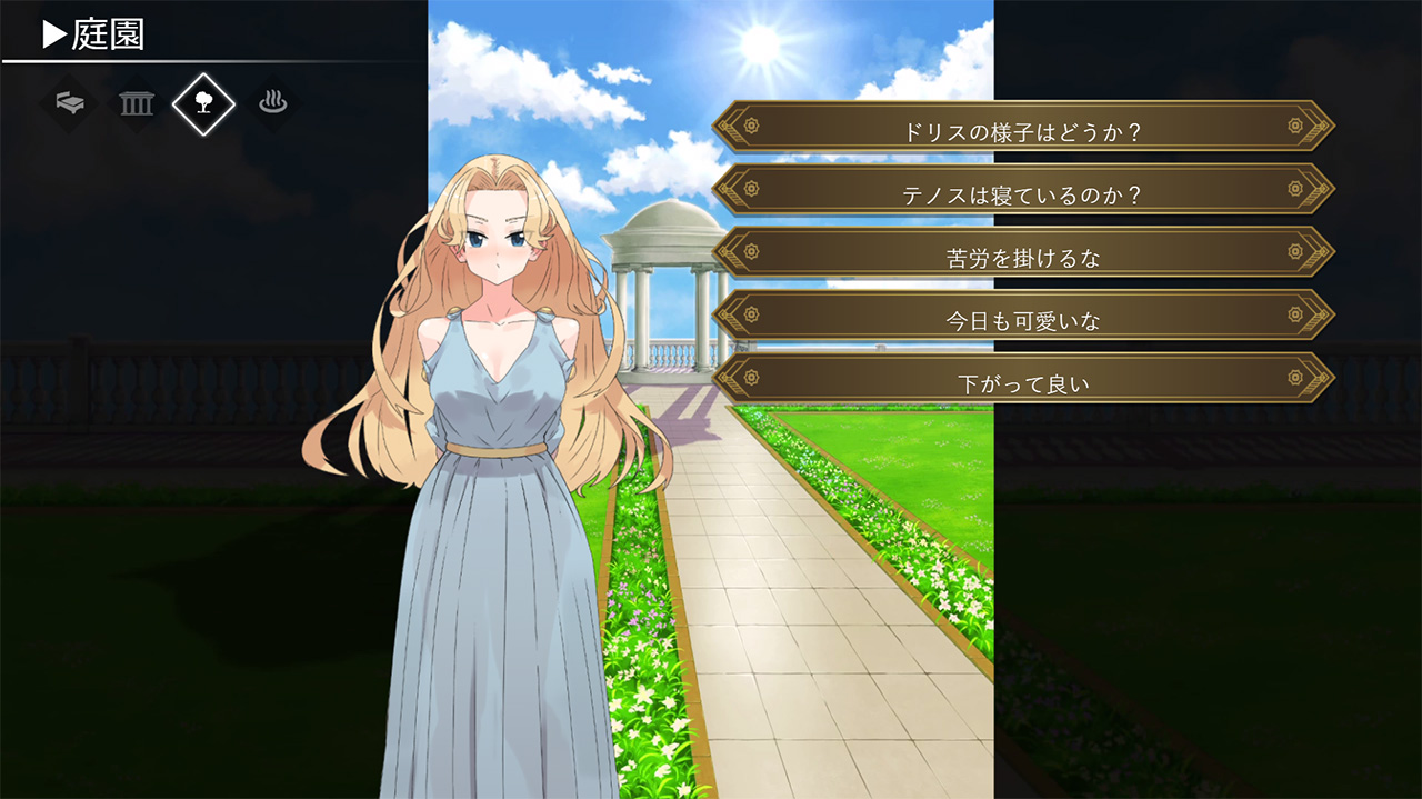 ▲「ストーリーモード」では、ドリスや侍女たちと交流を持つことができ、日常の会話やスキンシップも楽しめるようになっている