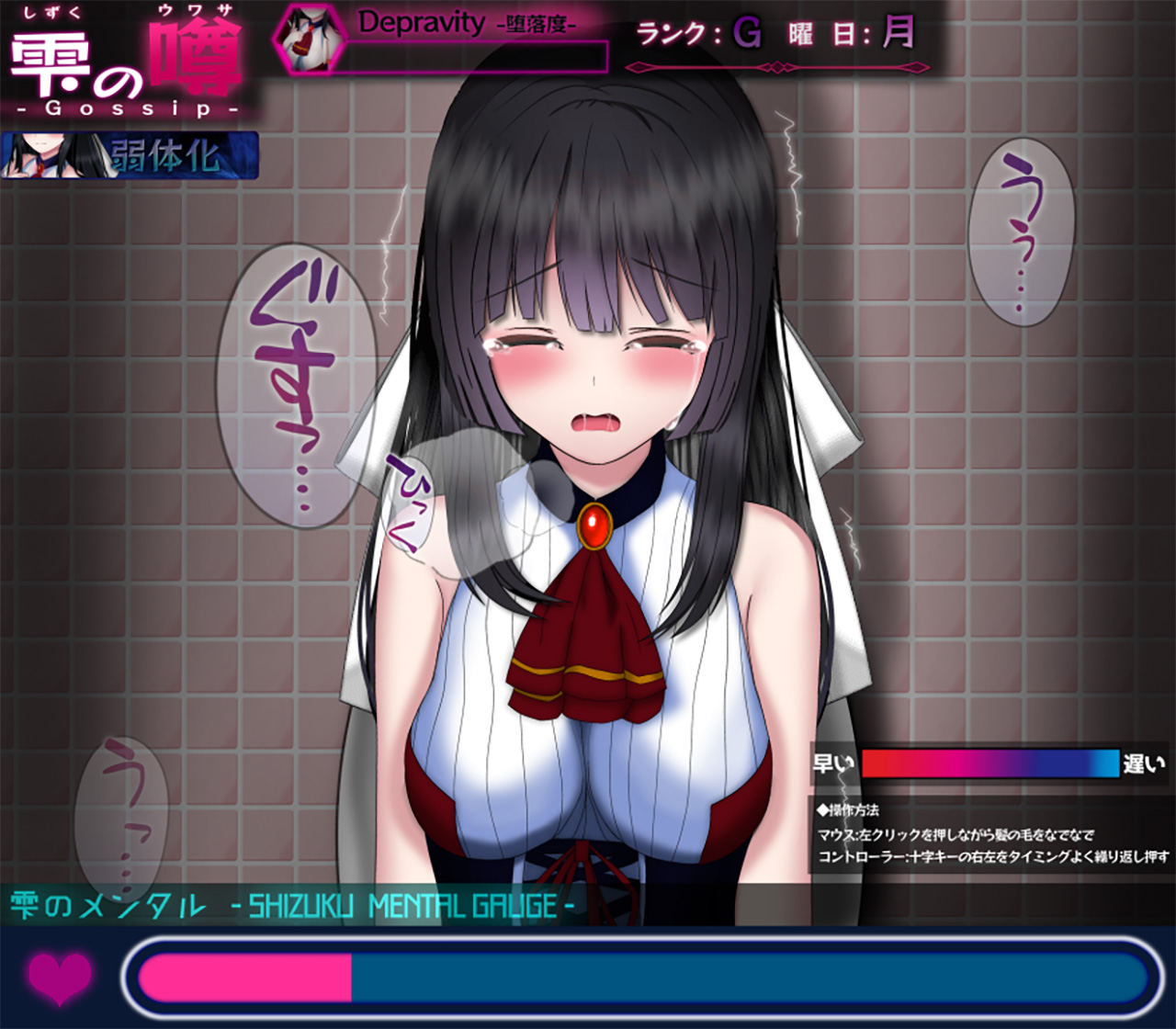 ▲雫がトイレで1人になると、彼女をなでなでするミニゲームが発生。カースト学園で辛い目に遭い続ける雫を慰めて、メンタルを回復してあげよう。また、この時にアイテムの「妊娠検査薬」を持っていると…!?