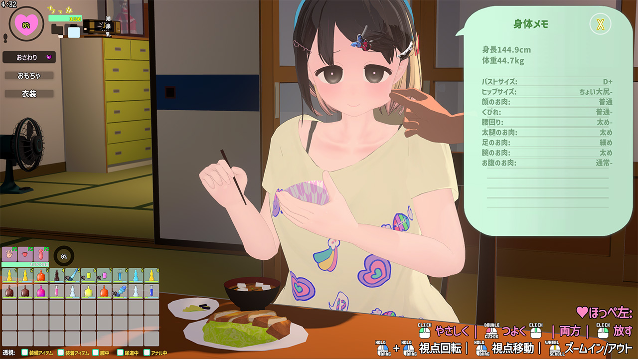 ▲日々の食事によって、ちっかの体型が変化するユニークなシステムを搭載。顔、おっぱい、ウェスト、お腹、腰回り、お尻、太もも、足、腕と体の部位ごとに緻密に肉づきが変化する本格的な仕様で、彼女を理想の体型に育て上げられるぞ