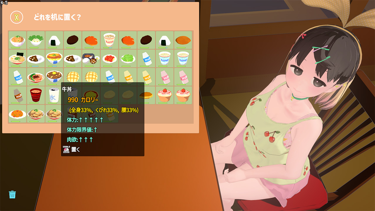 その他、100種類以上の食べ物が登場し、摂取カロリーによってちっかの体型が太ったり痩せたりする他では類を見ないシステムも実装されていて、現実に限りなく近い没入感激高の同棲ライフを体験できるのだ♪