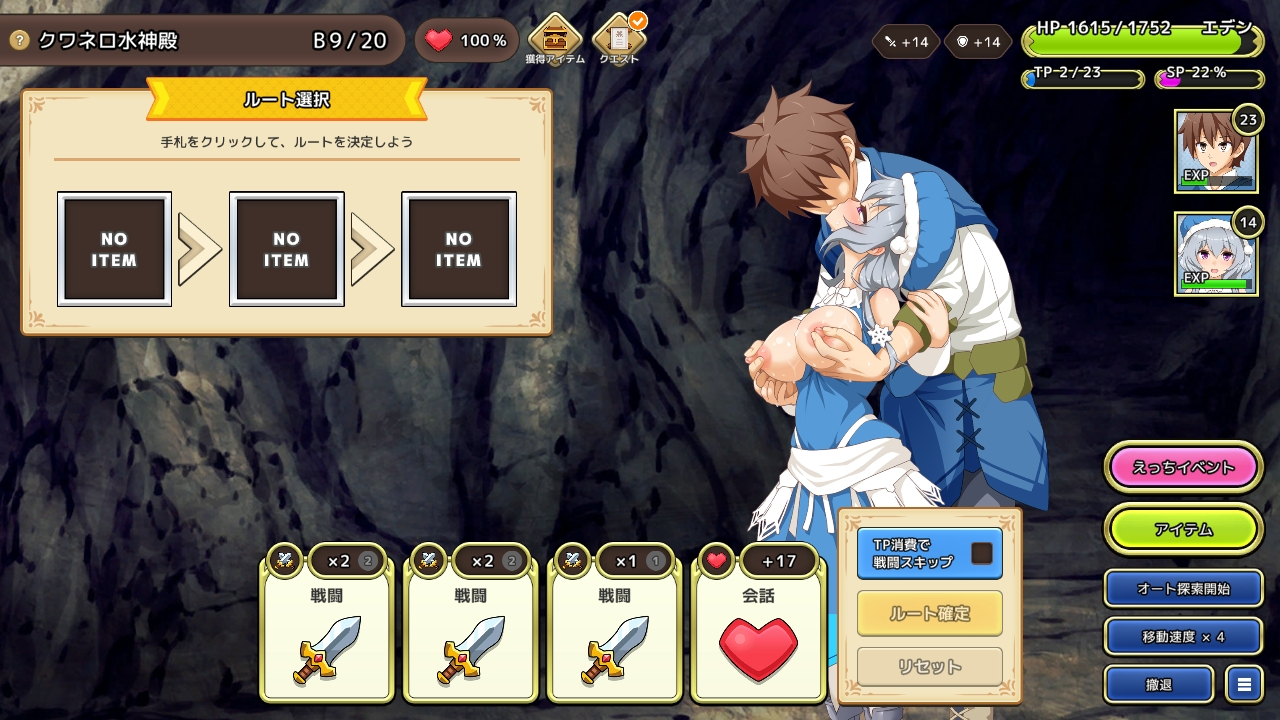 ダンジョン探索も戦闘に関してはオートで進行するので、ポーションなどのアイテムを使用するときのみ介入すれば、基本的にごり押しで勝利可能となっていますのでゲームが苦手な人でも安心して進めることができます。また、ダンジョン内でも「会話」を選択することで性欲が上昇し、一定量になるとHに持ち込むことが可能となり、ここでも「えっちバトル」が楽しめるようになっています。