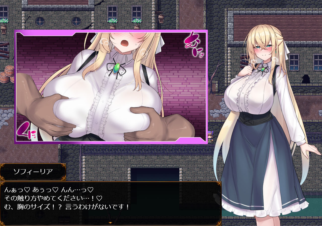 ストーリーや戦闘、イベント構成は完全にヌキ特化の仕様となっていて、大陸を巡る旅の道中、ソフィーリアは盗賊やならず者、金持ちのパトロン、浮浪者、クソガキ、ゴブリン等々、あらゆる男たちにその豊満な肢体を狙われていくことに。