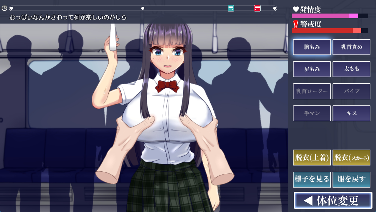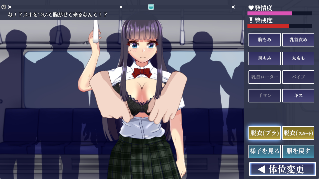 痴漢パートではヒロインの警戒ゲージがMAXになるか、痴漢時間の超過で強制終了。ゲームオーバーはないので、基本的にはガンガン責めて発情させるのが◎ ちなみに痴漢時間はリアルタイムで進むのではなく、行動する度に時間が経過するので、焦らずにプレイすることができるのだ。