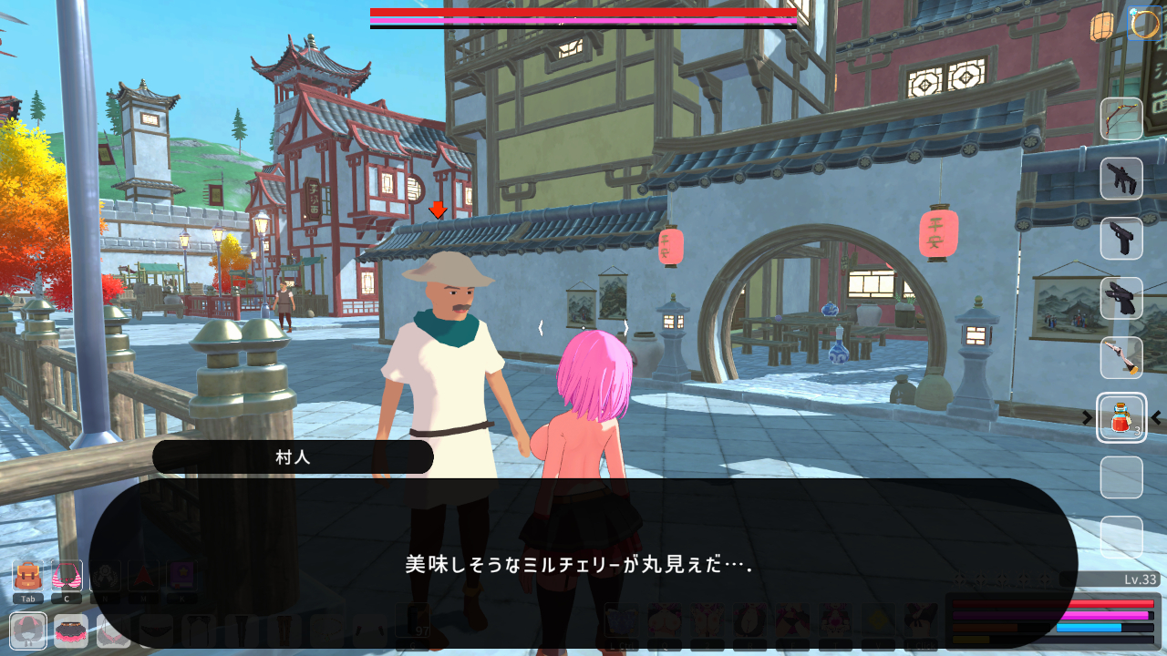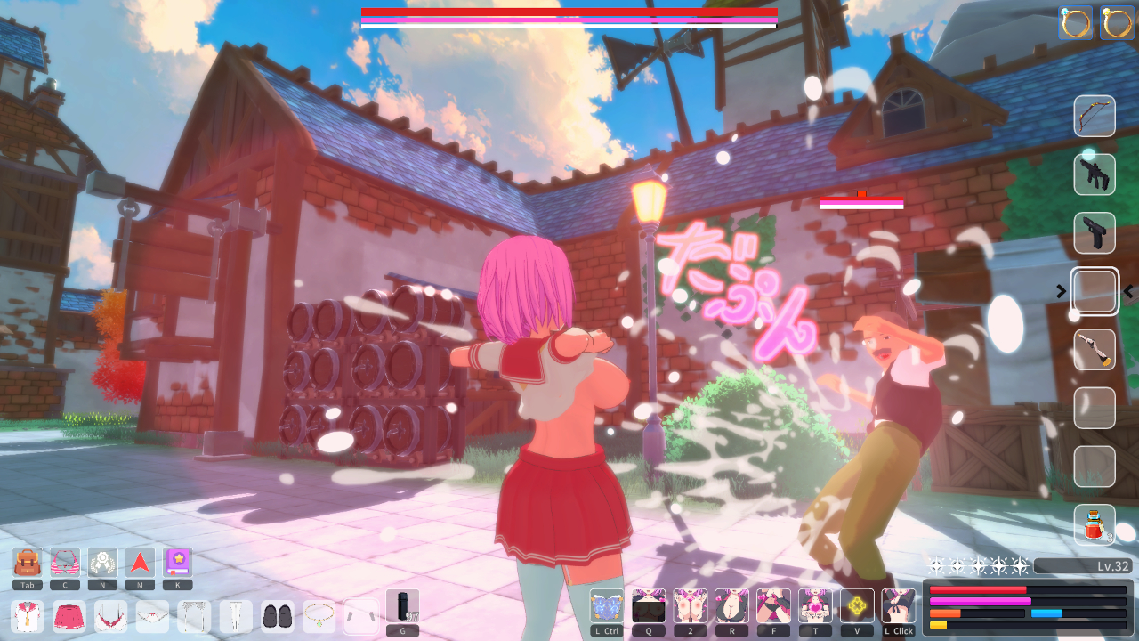 エロ要素としても主人公の衣装の着せ替えや誘惑アクションのエロモーション、さらに村人から魔力を分けてもらうドレイン系のエッチ、そして吹き飛ばされるほどのダメージをうけた後、すぐにまたダメージを受けると衣装が破れるアーマーブレイクも搭載!!