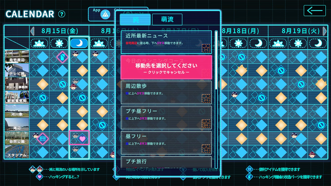 本格的な盗撮生活を体験できる本作では、「カレンダー」機能でメインヒロインの純と萌流の予定を確認して、会いに行くことでストーリーが進行。