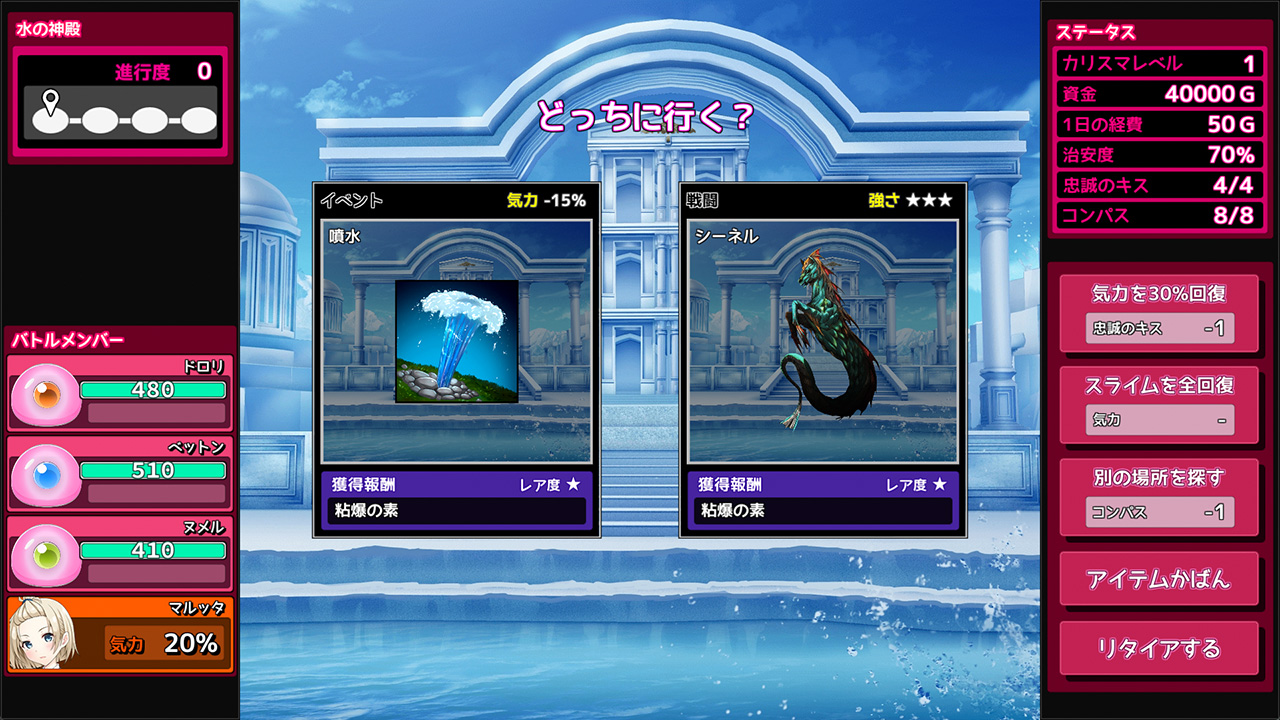 バトルでは主人公に立ち向かってくるヒロインを、スライムで拘束し性感スキルを駆使して屈服させよう。