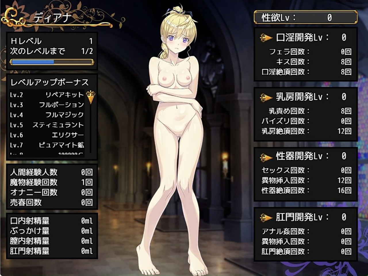 ▲ディアナのHレベルに応じてアイテムを獲得できる「高性能エロステータス」、移動時間を短縮する「ファストトラベルシステム」、レベル差の開いたザコ敵を体当たりで倒せる「バトルコンタクトモード」等々、快適に遊べるようシステム面も非常によく作り込まれている