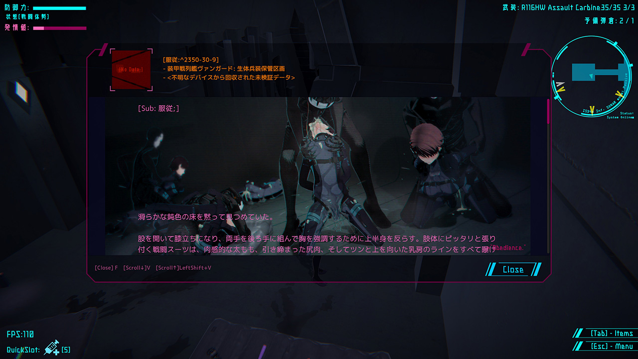 ▲マップ内には先行部隊が放棄したコンピュータシステムやログデータが点在。それらを回収することで、他の生体兵装たちが課せられた過酷な奉仕の記録(HCG&ストーリー)を閲覧できる