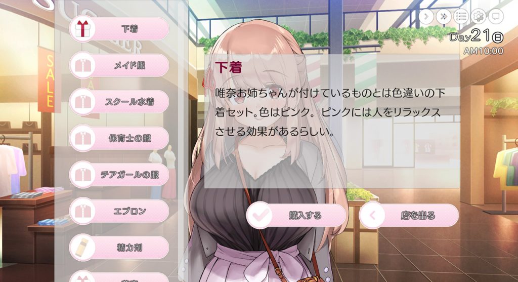 ▲ショッピングで唯奈のコスチュームを購入可。H中は着ている衣装に合わせて、彼女の言葉遣いが特殊なものに変化するぞ