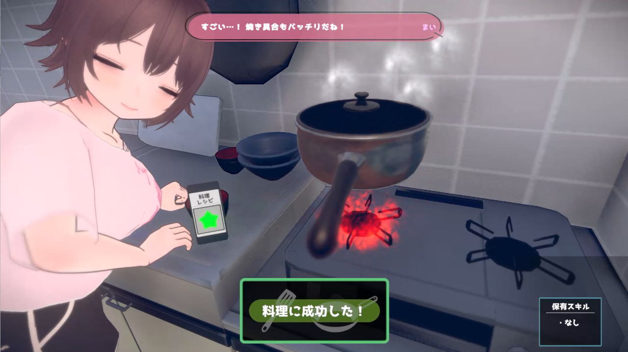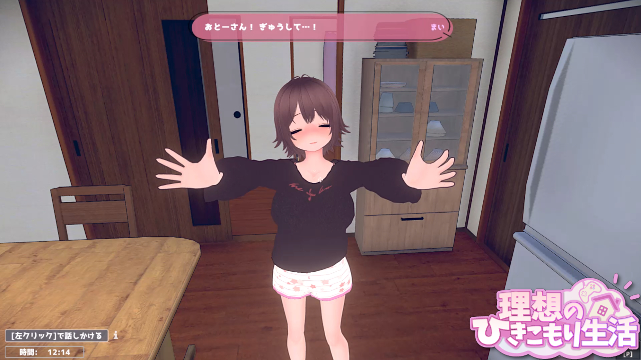 娘との日常生活を、とことんリアルにシミュレーションしている本作。本作のヒロイン・まいはソファでくつろいだり、歯磨きをしたりと家の中で自由に過ごしているので、話しかけて料理を作ってあげたり、雑談をする等の交流を行う事によって好感度が増減していくぞ。