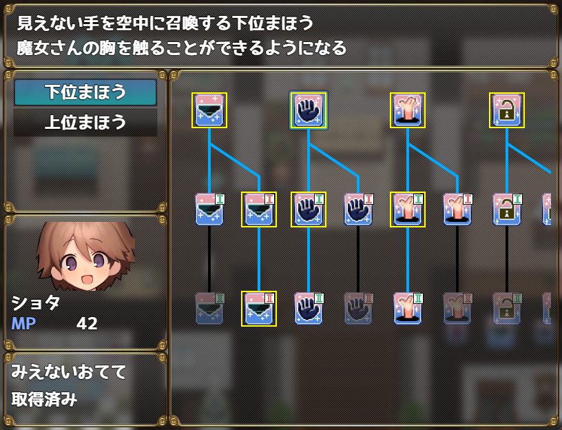 ▲魔法を覚えることで魔女さんにイタズラすることが可能となるぞ。魔法は全部で7種類用意されているので、全部覚えて無防備な魔女さんにイタズラしまくろう♪