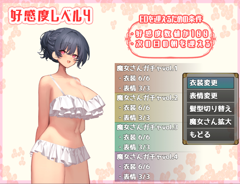 また、修行の一環として家の掃除を任されることになった主人公。家中のゴミを片付けてキレイにするとご褒美としてポイントを貰えちゃうぞ。そしてそのポイントを使うことで下着や水着を当てる“ガチャ”を回すことが可能となっている。基本衣装8種類、色違い16種と、多彩な衣装が用意されているので魔女さんに着替えてもらっちゃおう♪