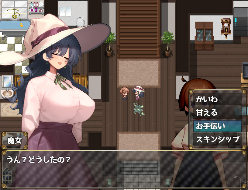 本作は、魔女さんの家の中を自由に移動しながら、会話・掃除・お手伝いなどを通じて魔女さんの好感度と主人公のMPを上げていくSLG。魔法を使ってのイタズラや話しかけることで発生する甘えを通して二人の距離が縮まっていき、その好感度段階に応じて関係性やHがエスカレートしていくのだ。