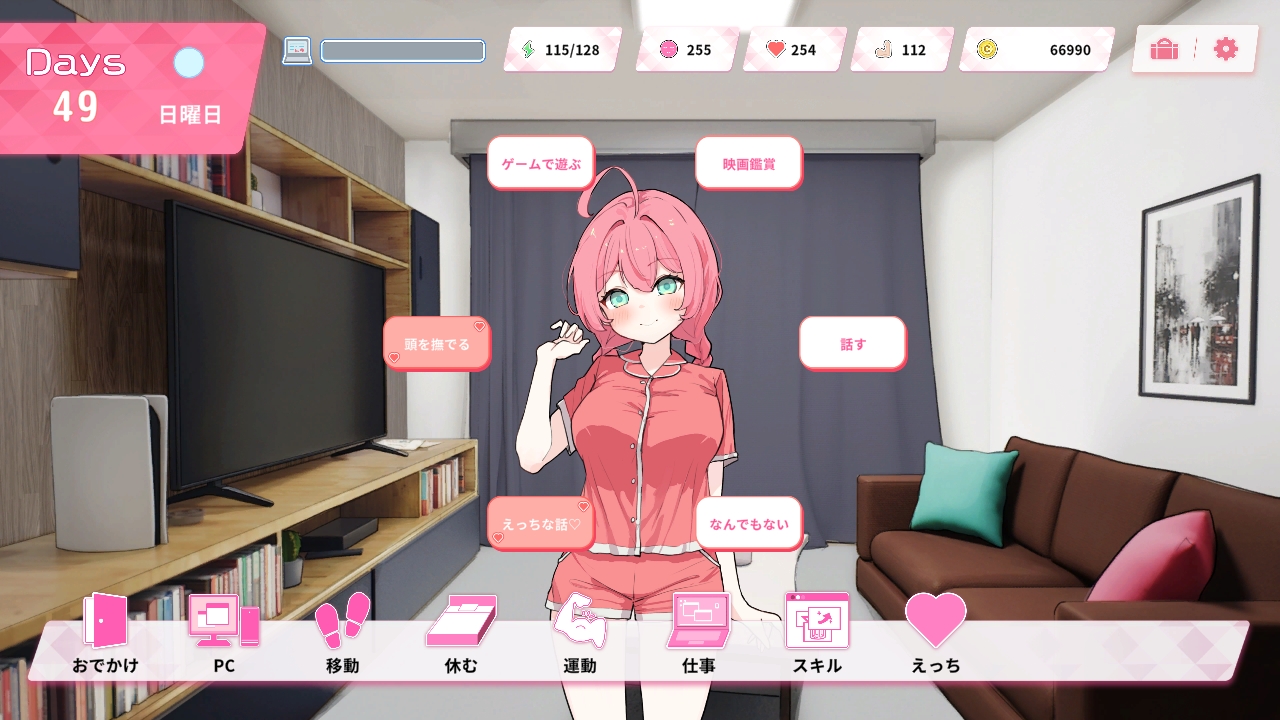 主人公には好感度(会話や交流で上昇)・親密度(頭をなでたり大人向けの行動をすることで上昇)・体力(運動等)という3つの主要ステータスがあり、日々の生活の中でそれらのステータスを上昇させることでイベントが解放→さらに進めてHが解禁→妹ヒロインをHで開発しながらエロスキルを獲得→さらに新たなエロイベントが解放されるという流れで物語が進んでいくようになっています。