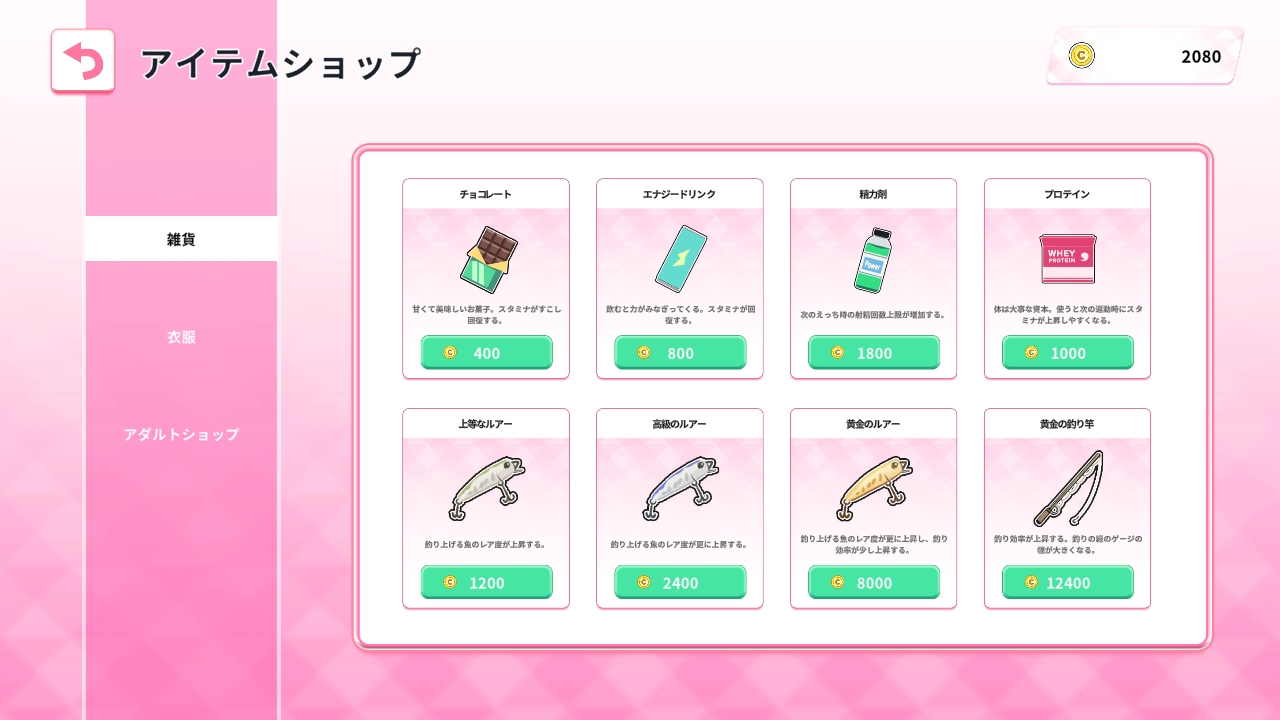 ▲ショップには様々なアイテムを売っているので、それらの購入には資金が必要となる。釣った魚をその場で換金できるので、仕事以外にもお金を稼ぐことができるのだ