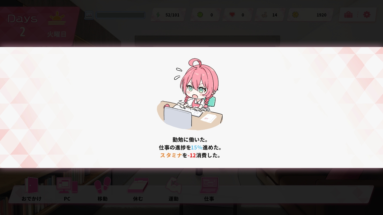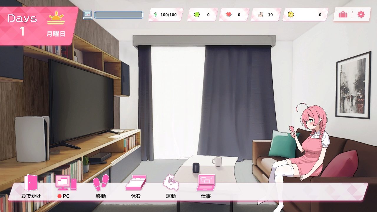 ▲基本画面では、上部に主人公のステータスが表示される。一番左側から、PCのバーが仕事の進捗、次がスタミナとなり、好感度、親密度、体力となっている。さらにコインマークが現在の所持金、鞄がアイテム、そしてセーブやロードの画面だ