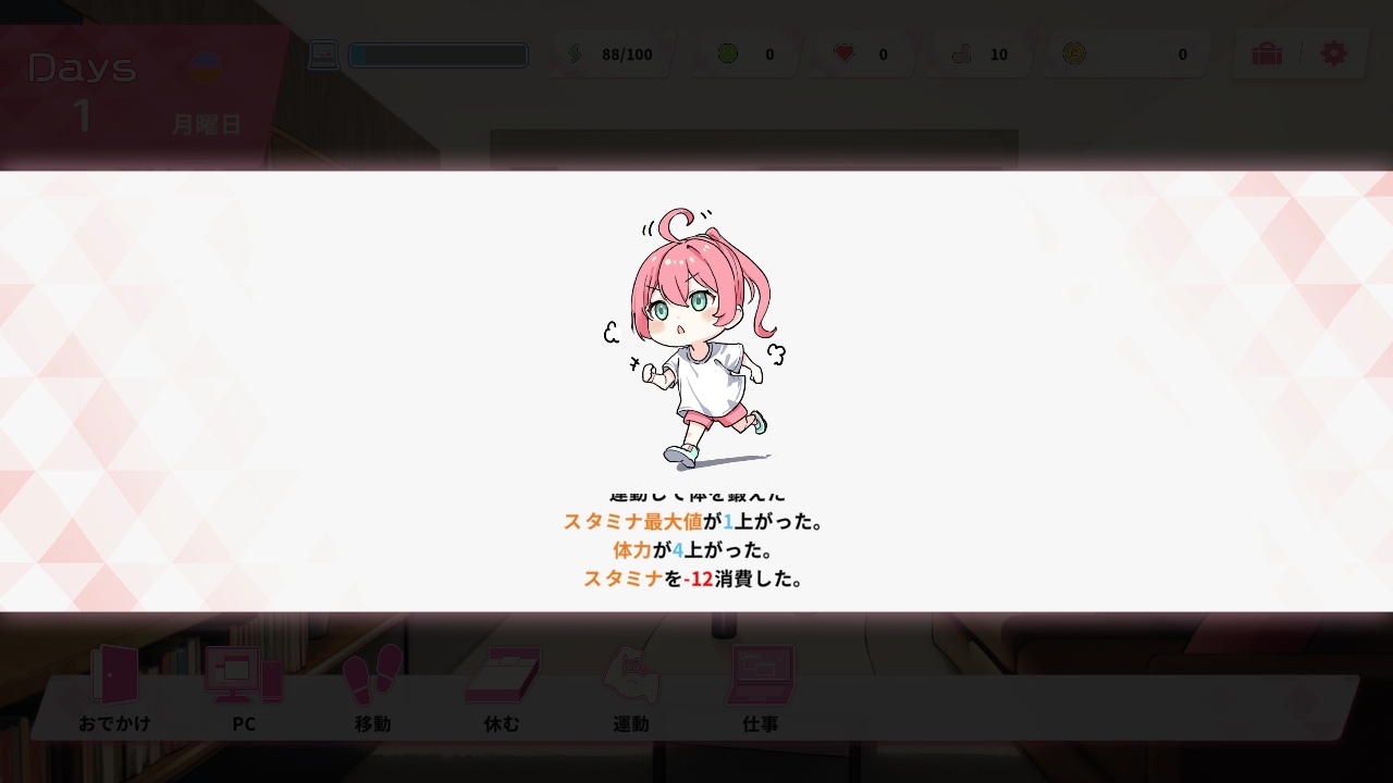 ▲仕事や運動を選ぶとキュートなSDキャラが表示されるぞ♪ 見ているだけでも癒されちゃうね