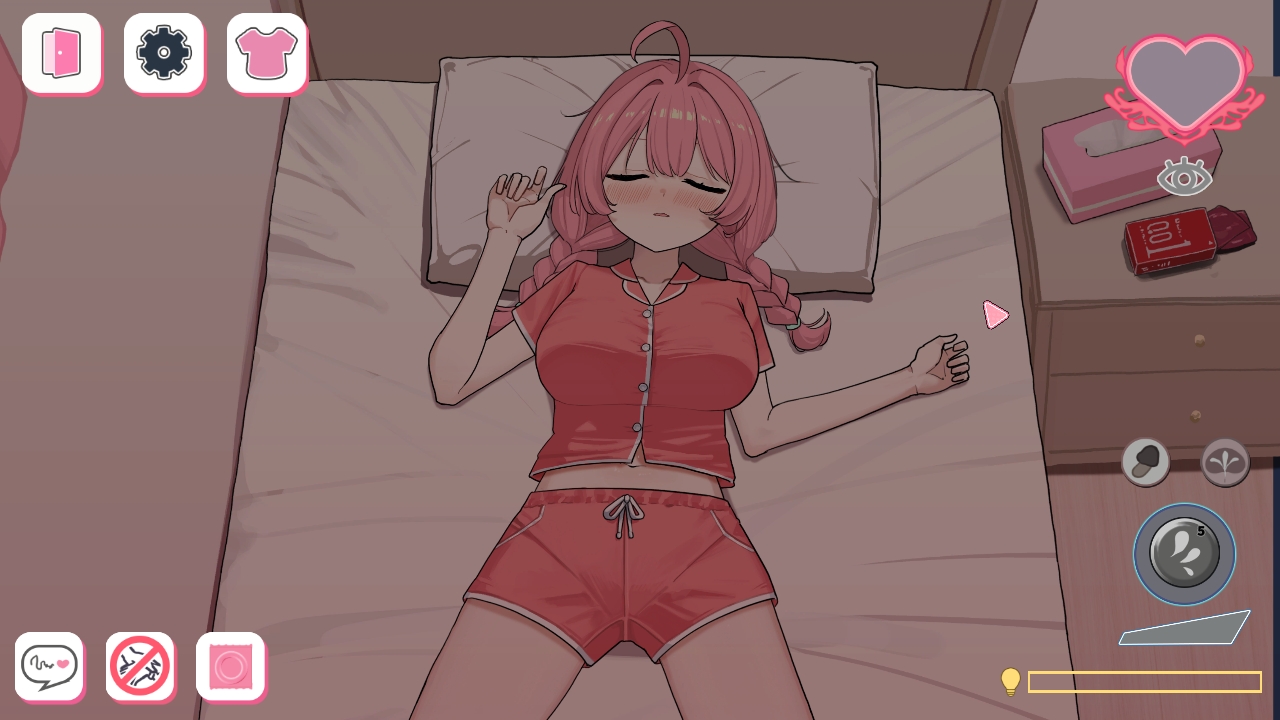 ▲ついに夜這いスタート!! 最初は胸かアソコをクリックしたままマウスで触りまくろう。画面右上のハートマークが絶頂ゲージで、その下の瞳が覚醒ゲージとなる。目を覚ましそうになったら頭を撫でて眠ってもらおう♪