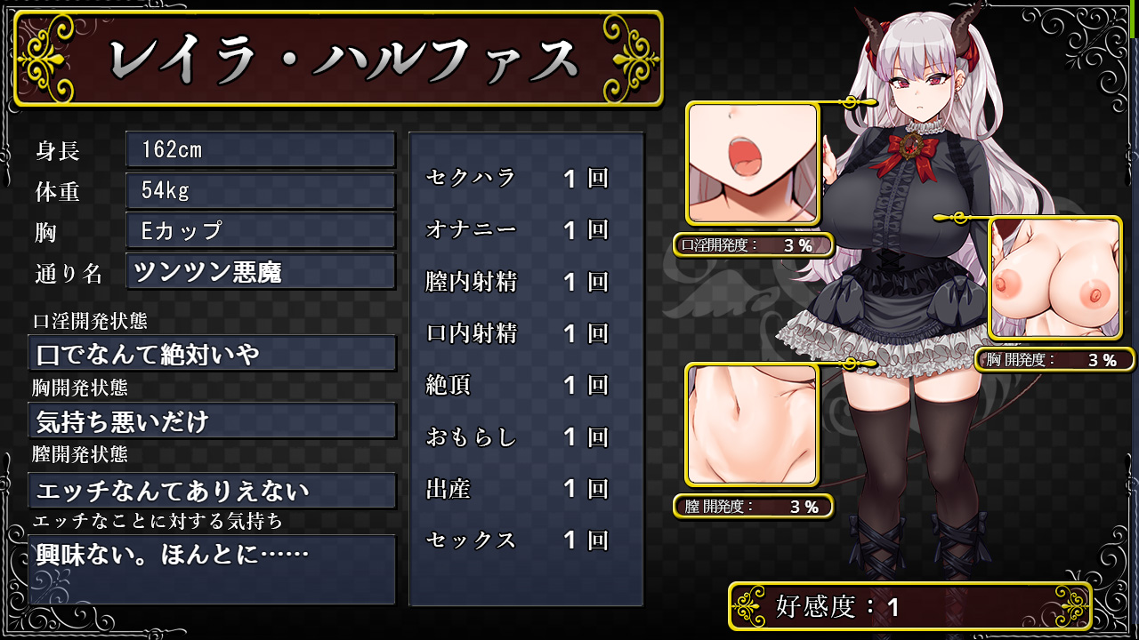 本作に登場する3人の悪魔っ娘ヒロインは、主人公の勇者とは敵対関係なので序盤は非常に反抗的だ。しかし勇者の力を使えば、そんな彼女たちを強引に従わせて調教Hに持ち込めるぞ。さらに一緒に旅をしていく中で各ヒロインの好感度を上げれば、Hの内容がラブラブなものへと変化していくことも。強制羞恥プレイからいちゃいちゃハーレムHまで、自分好みのヤリまくり冒険を謳歌することができちゃうのだ♪