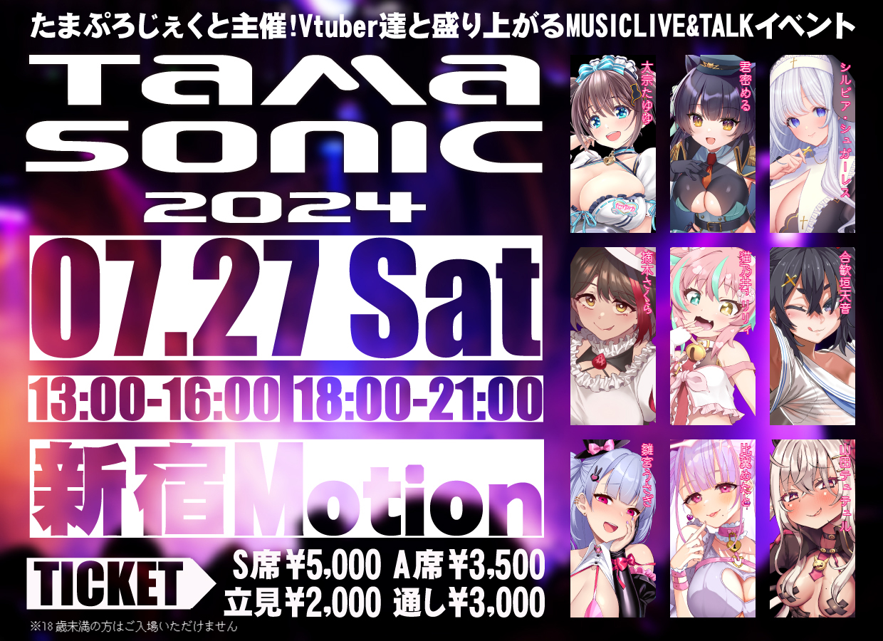 「TAMA SONIC 2024」は、7月27日(土)にライブハウス「新宿Motion」で開催される、VTuberによるMUSIC LIVE&TALKイベント。二部構成になっていて、第一部は13時開演、第二部18時に開演になっている。