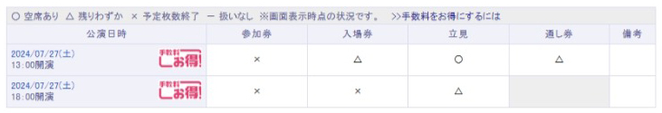 ・【1部2部通し券】……立ち見席の1部2部通し券で税込3,000円。チケット購入時の種類表記は「通し券」。