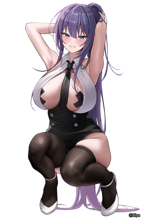 ▲腕を上げたポーズは可愛いだけじゃなく、腋もバッチリ見せてくれるのがエッチで嬉しいですね。おっぱいに挟まれたネクタイは幸せそう