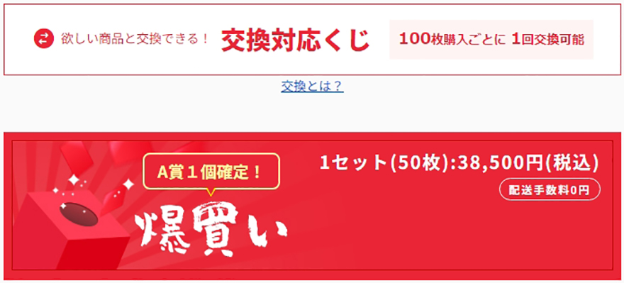 ▲100枚購入ごとに欲しいアイテム1つと交換可能の救済措置あり。1セット(50枚、税込38,500円、送料無料)の「爆買い」も可能だ