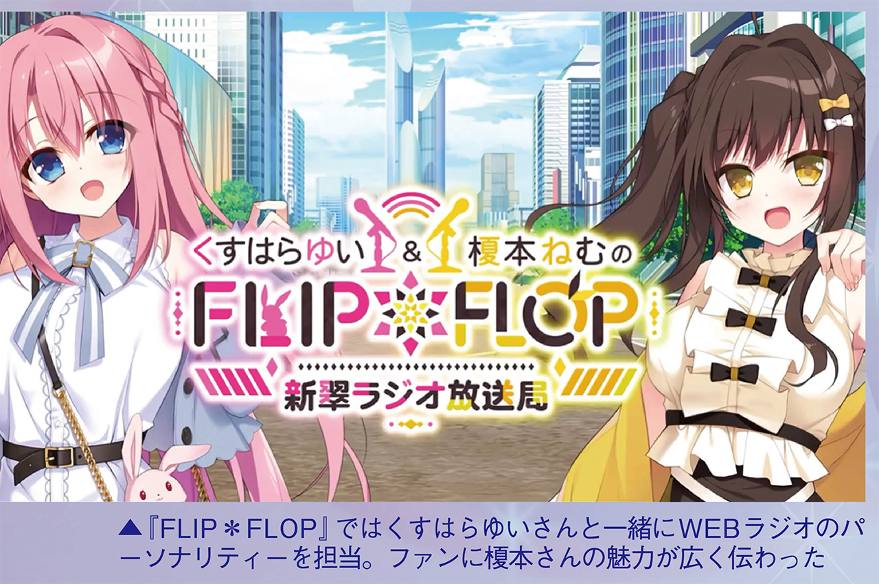 榎本:私とくっすー(くすはらゆい)はサブキャラ担当なんですけど、二人でWEBラジオ『くすはらゆい&榎本ねむのFLIP*FLOP新翠ラジオ放送局』のパーソナリティをやらせてもらえました。くっすーがパーソナリティは分かるんです。経験豊富なので安心して任せられるだろうなあって。でもデビュー2年目でラジオ経験なんか全くない私がなんで選ばれたのかなあって。ラジオのディレクターさんも、私がどんなヤツか、ちゃんと話せるのかも分からないで呼んでくれたんだと思うんですよ。でも、すぐに「こいつで遊んでも大丈夫そうだな」って思われたのか、変なメールは読まされるし、色々いじられたりとかしました(笑)。