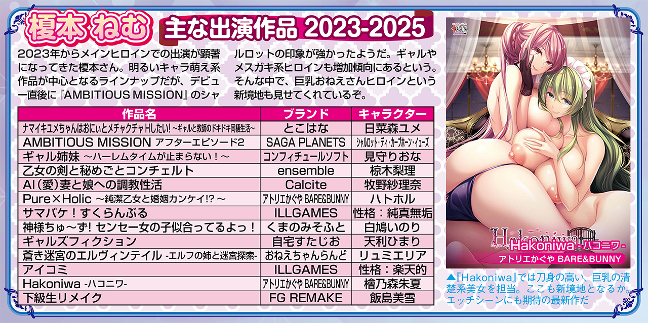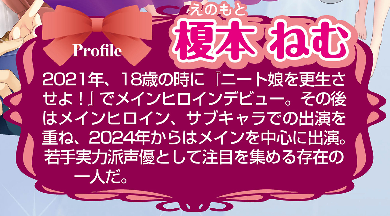 彼女自身がゲームのヒロインのように元気で前向きな榎本ねむさんは、アホっぽい子やメスガキ系キャラクターなどコミカルでノリノリな演技で活躍中。ここには掲載できなかったが他にも出演作品についての熱い思いもたくさん語ったもらったのぞ。さらに機会があればシリアスな物語やハードな作品にも挑戦する意欲も…!?
