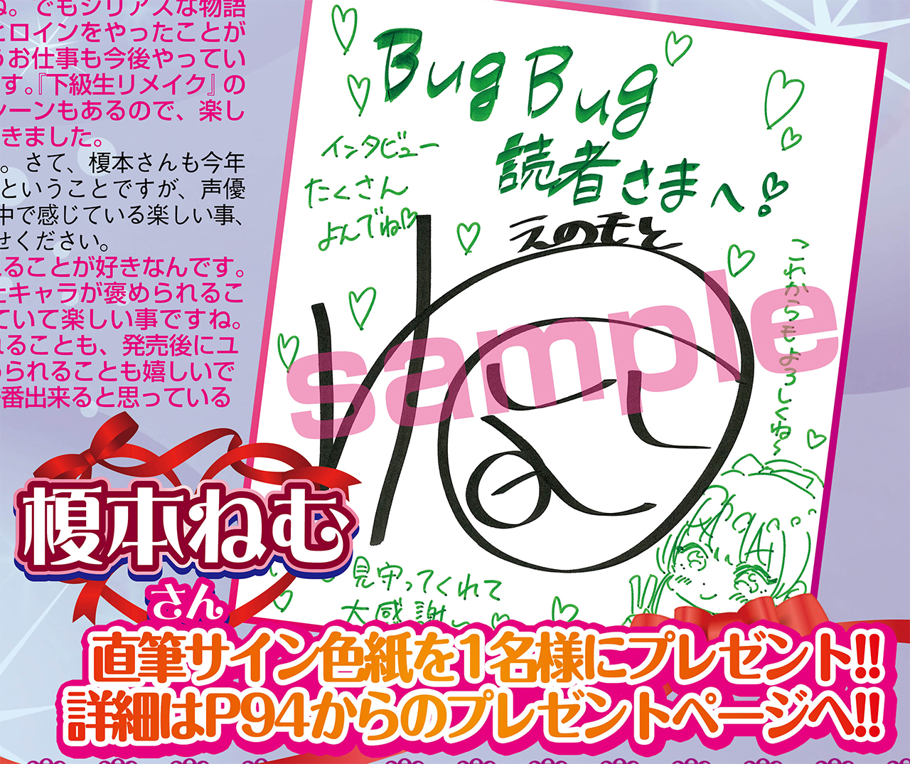 ▲ハートマークがいっぱいで見ているだけで元気になりそうな榎本さんの直筆サイン色紙をプレゼント!! 紙版のBugBug本誌についているアンケート用紙を使って応募しよう