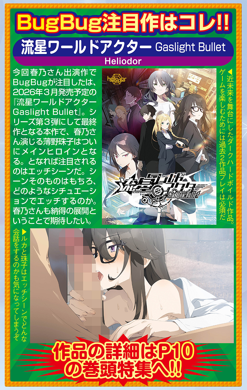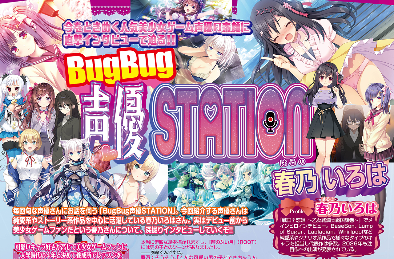 BugBug本誌の人気コーナー「BugBug声優STATION」。1月号では純愛系やストーリー系作品を中心に活躍している春乃いろはさんが登場。デビュー前から美少女ゲーム好きで様々な作品をプレイしていたという彼女にじっくりとインタビューを行ったぞ。カラー4ページにびっしり詰め込まれた濃い内容の一部をここで特別にお見せしよう。