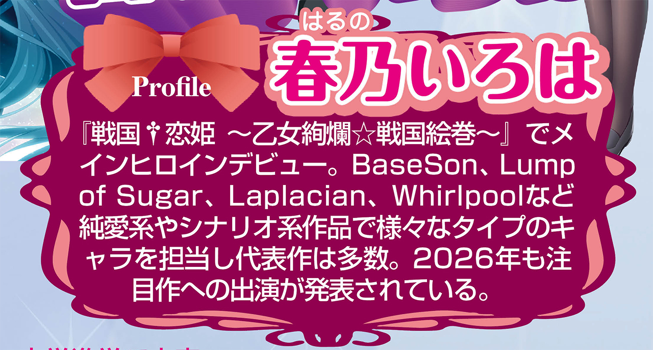 春乃:私も元から美少女ゲームが大好きなユーザーでした。そんなユーザー視点もプラスして、今後も収録をしていきたいと思います。私の名前を見かけたら、ぜひゲームをプレイしてください。このインタビューを読んでいただいたメーカー関係者の皆様、ぜひ一緒にゲームを作らせてください。