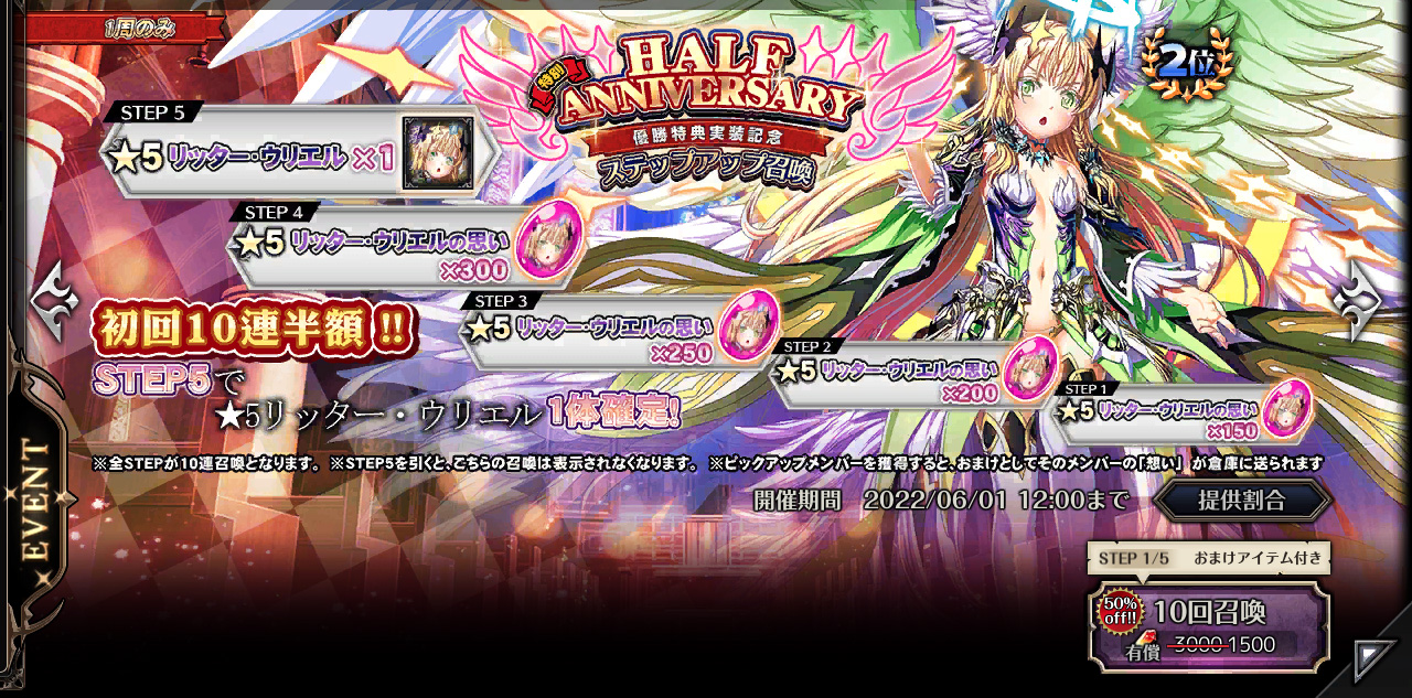 「ハーフアニバーサリー総選挙」にて1位に入賞したリッター・ルシフェルのピックアップ召喚イベント。総選挙1位の特典として、絆ストーリー&Hシーンがそれぞれ1つずつ追加されたのだ。また期間限定で、「ハフアニ総選挙1位特典実装」記念セットの販売も行っていたぞ。