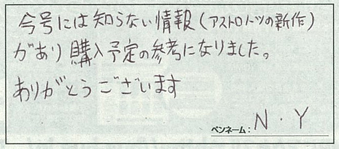 最:まずN・Yさんからは、アストロノーツの新作情報を知る事が出来たという、感謝のおハガキをいただきました。