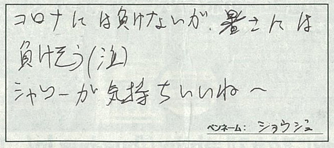 最:しかしコロナ禍が収まらないので、この暑さでマスクを着けていると、熱中症も心配ですね。