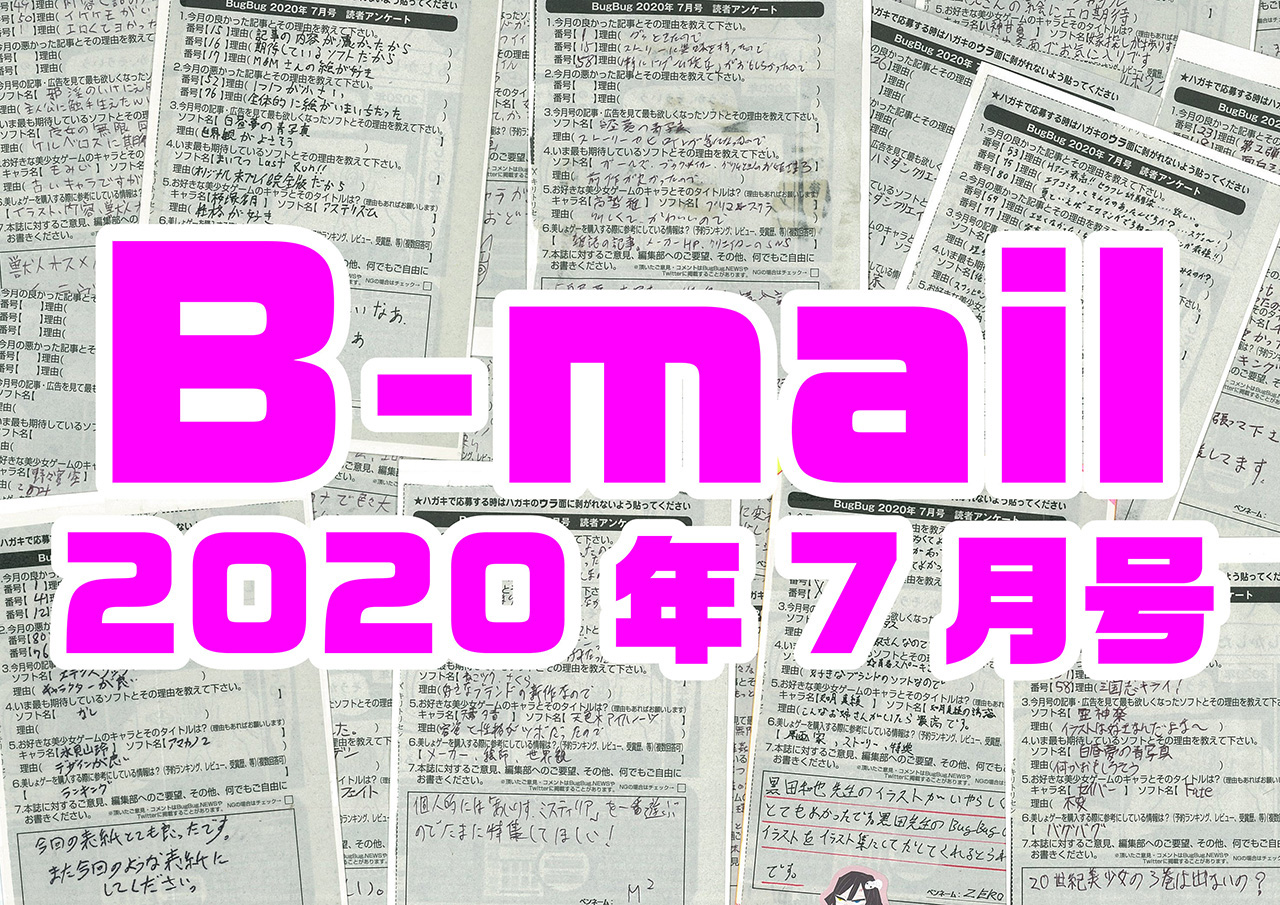 BugBugの名物読者コーナー「B-mail」がBugBug.NEWSでまさかの復活。BugBugのカリスマ編集長・マス、編集部の良心的存在な中堅編集者・最、そして弄られ役の変態若手編集者・チェン。BugBug編集部で働く3人のパーソナリティーが読者から送られてきた意見についてコメントしていくぞ。今回はBugBug7月号(6/3発売)の読者ハガキからピックアップして紹介!!