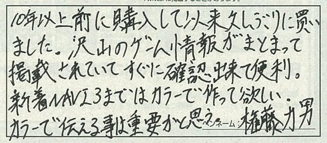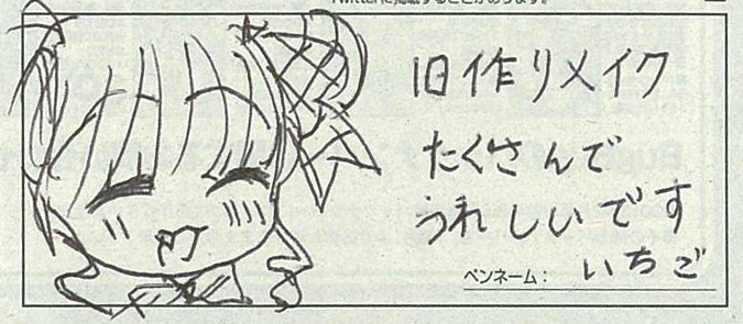 マス:先月の8月号では、まどそふと新作『セレクトオブリージュ』の表紙効果で、初めて買ったというお便りが多かったけど。今月も権藤力男さんのように久々に購入したり、初めて購入したという人が多かったみたいだな。
