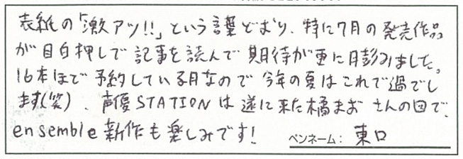 最:東口さんからは、BugBug7月号の表紙についてコメントをいただきました。16本も予約しているなんて凄いですね!!