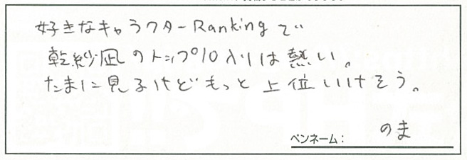 Show.:のまさんから、BugBug本誌で毎号掲載しているランキングコーナーについてのコメントが届きました。乾紗凪は、ぱれっとの『ましろ色シンフォニー -Love is pure white- Remake for FHD』に登場するキャラクターですね。