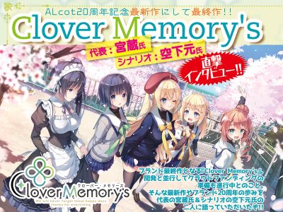 HOME > Clover Memory's Clover Memory's ALcot『Clover Memory's』のクラウドファンディングは5月末まで!! ブランド20周年記念の最新作であり最終作を現在公開中の情報と合わせて紹介 2024/5/12 【BugBug】5月号ではALcot20周年記念作にして最終作『Clover Memory’s』に込めた想いを代表・宮蔵氏とシナリオ・空下元氏に直撃インタビュー!! 2024/4/28 【BugBug】5月号は本日発売!! CLOCKUP最新作『鏖呪ノ嶼』を総力特集!! 新展開『恋姫』シリーズ独占スクープやALcot最終作インタビュー特集など見所満載 2024/4/3